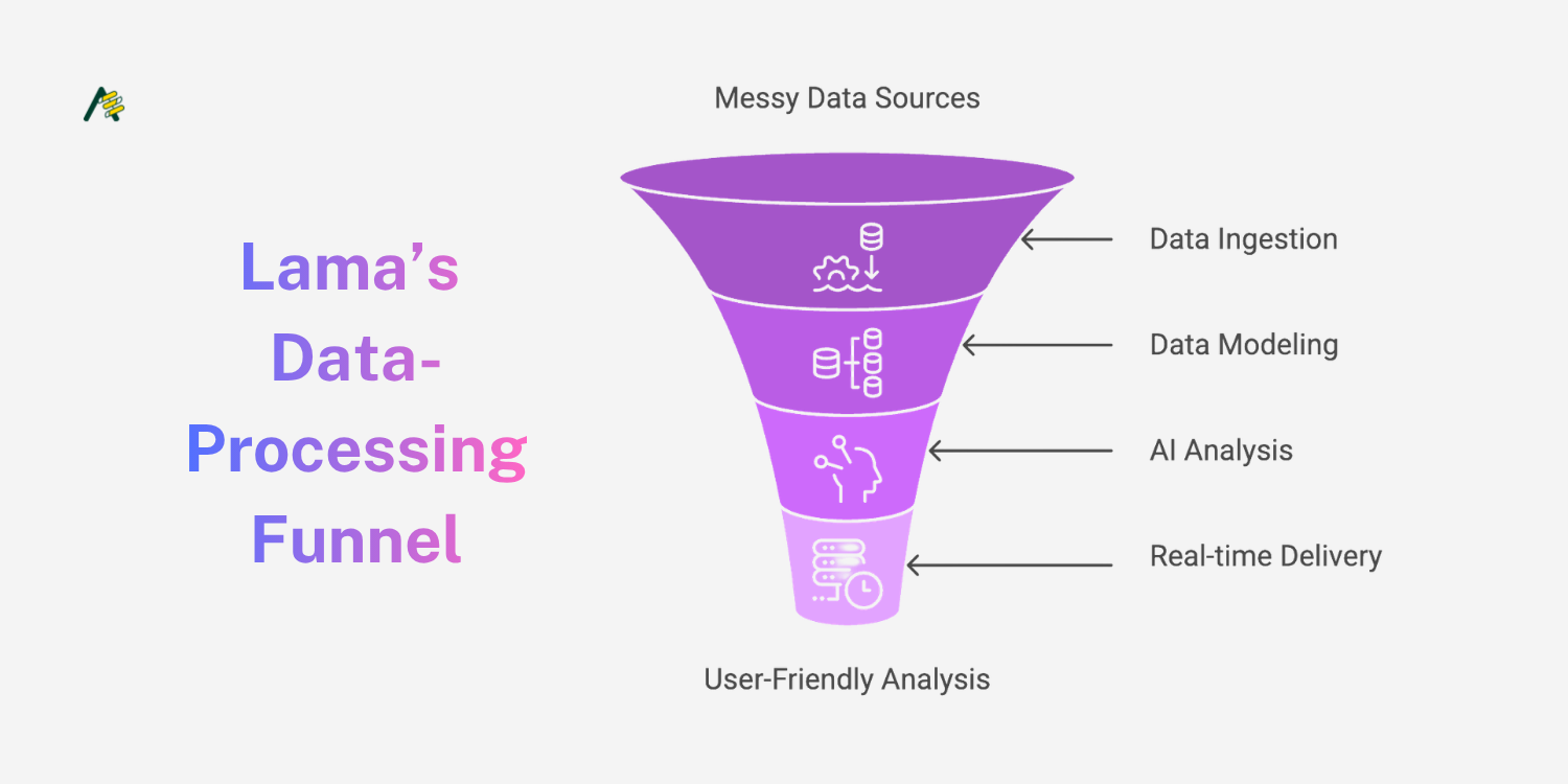 Lama's engineering challenge was significant: build a system that reliably ingests messy, multi-format data from a dozen sources, models it across four distinct database paradigms, and serves AI-generated analysis in near real-time — without requiring any user configuration.