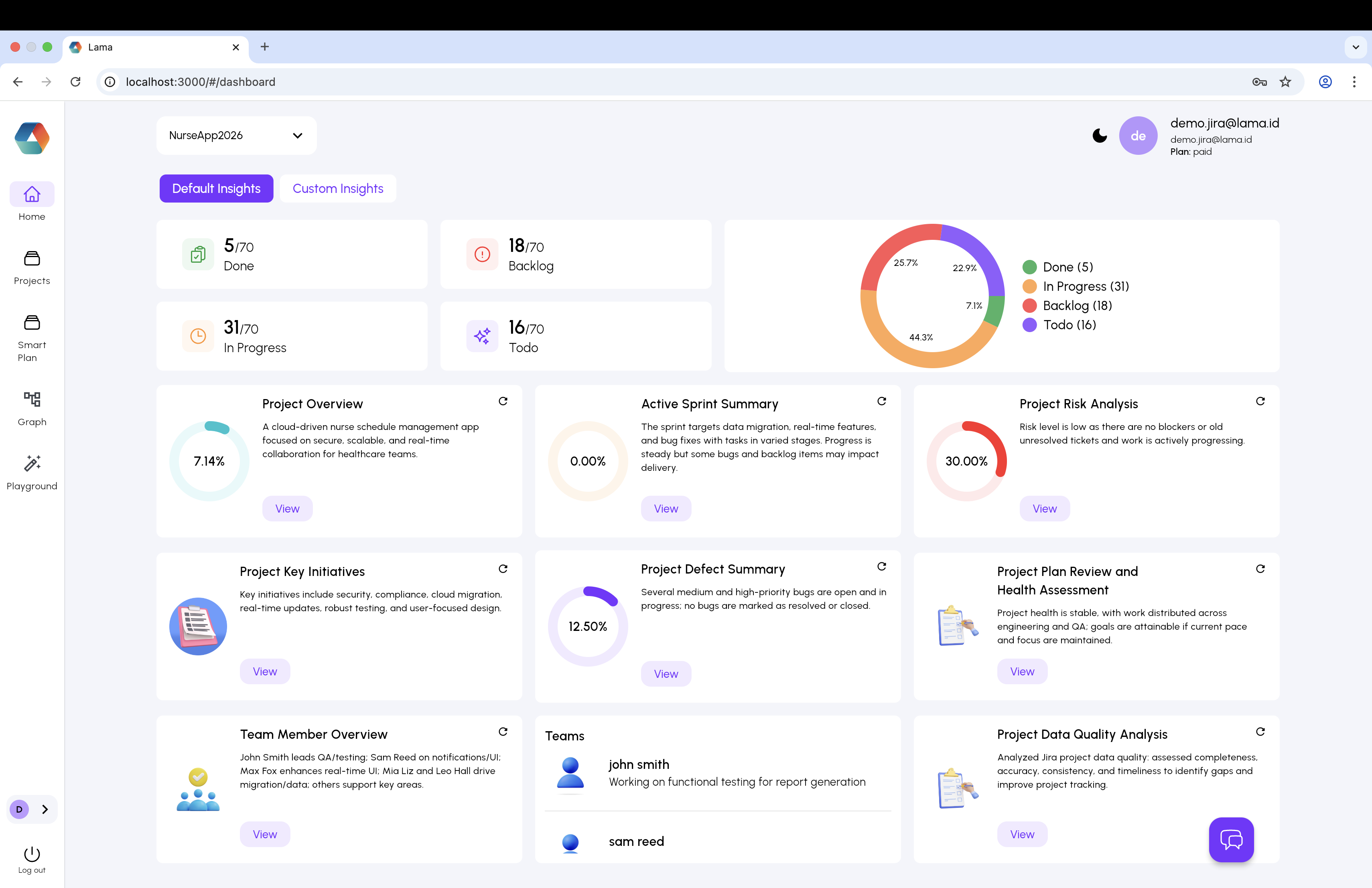 The Smart Plan feature extends Lama beyond read-only analytics into the project initiation workflow itself. Projects move through a guided pipeline: Upload → Plans → S.O.W → Jira Tickets → Release. Each stage is tracked and AI-assisted, from initial brief through to deployment readiness. This gives Lama richer context for analysis and creates stronger reasons for daily engagement.