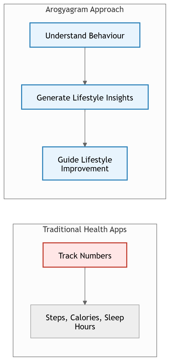 The approach adopted by Arogyagram emphasises transforming raw health data into contextual insights that help individuals understand the impact of their daily habits on their overall well-being. The platform therefore combines quantitative tracking with behavioural interpretation and personalised guidance.