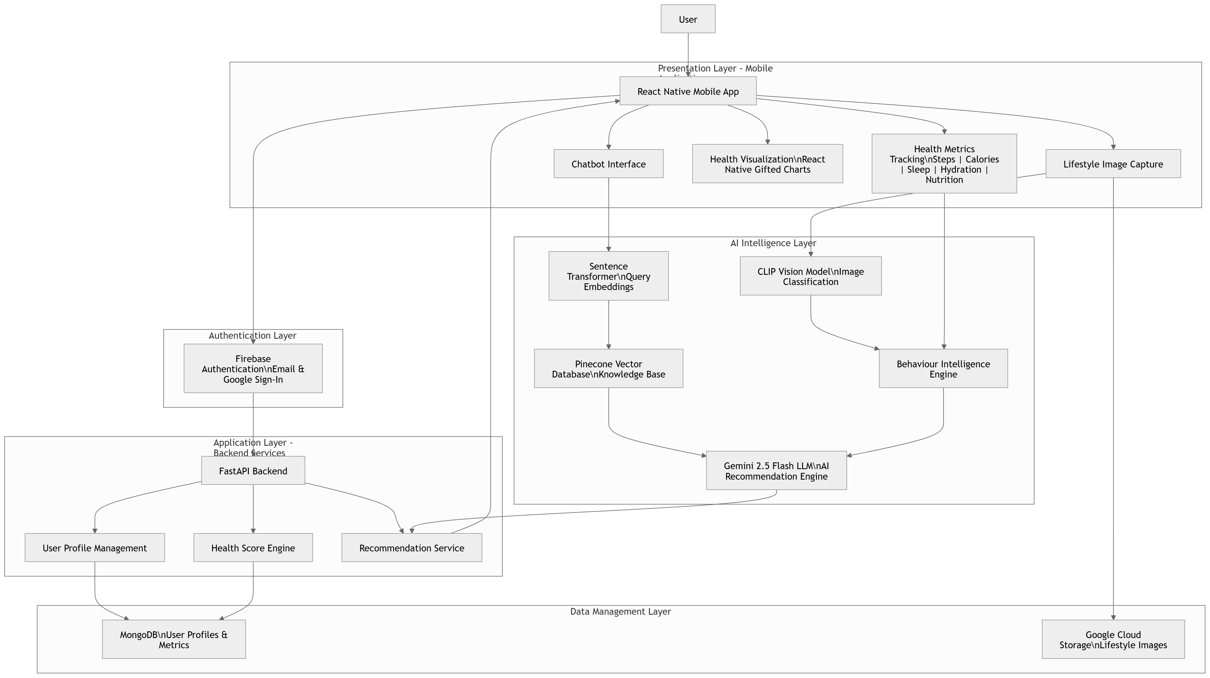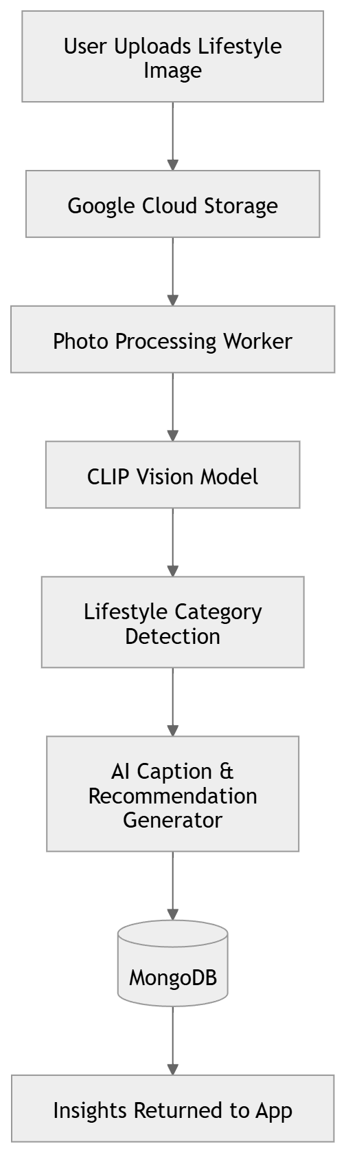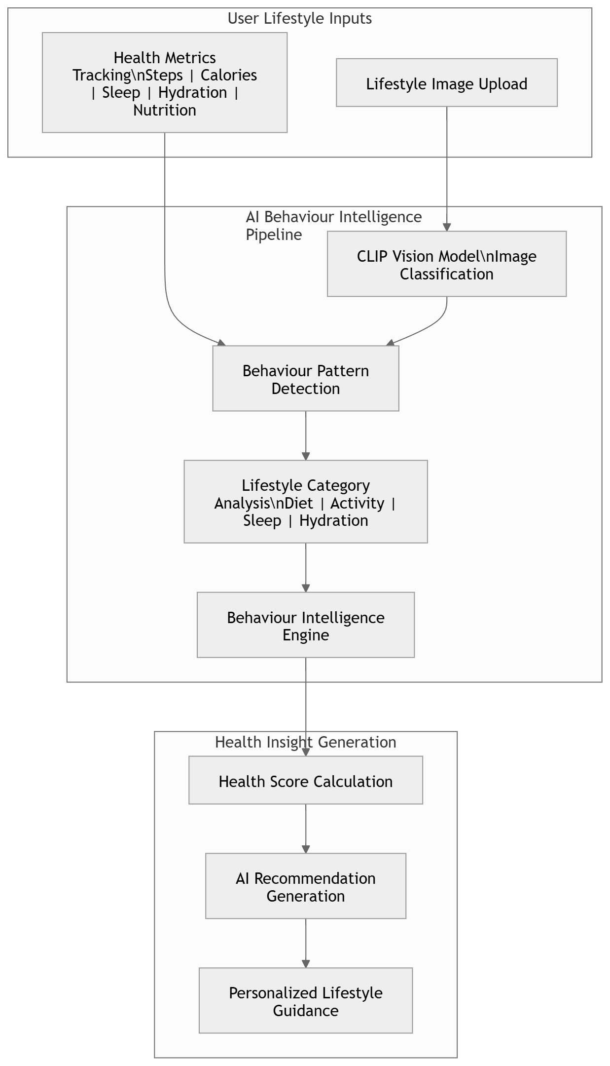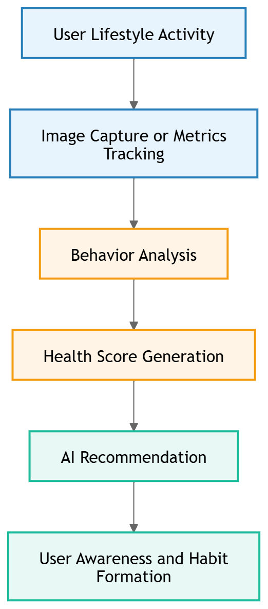 The platform employs advanced artificial intelligence techniques to analyze lifestyle moments captured by users through images, classify behavioral patterns, and generate personalized health recommendations. In addition to visual lifestyle analysis, the system also tracks various health metrics such as physical activity, nutrition, sleep patterns, hydration levels, and lifestyle risk indicators. These inputs are processed by a behavioral intelligence engine that generates Smart Health Metrics representing different dimensions of lifestyle health.