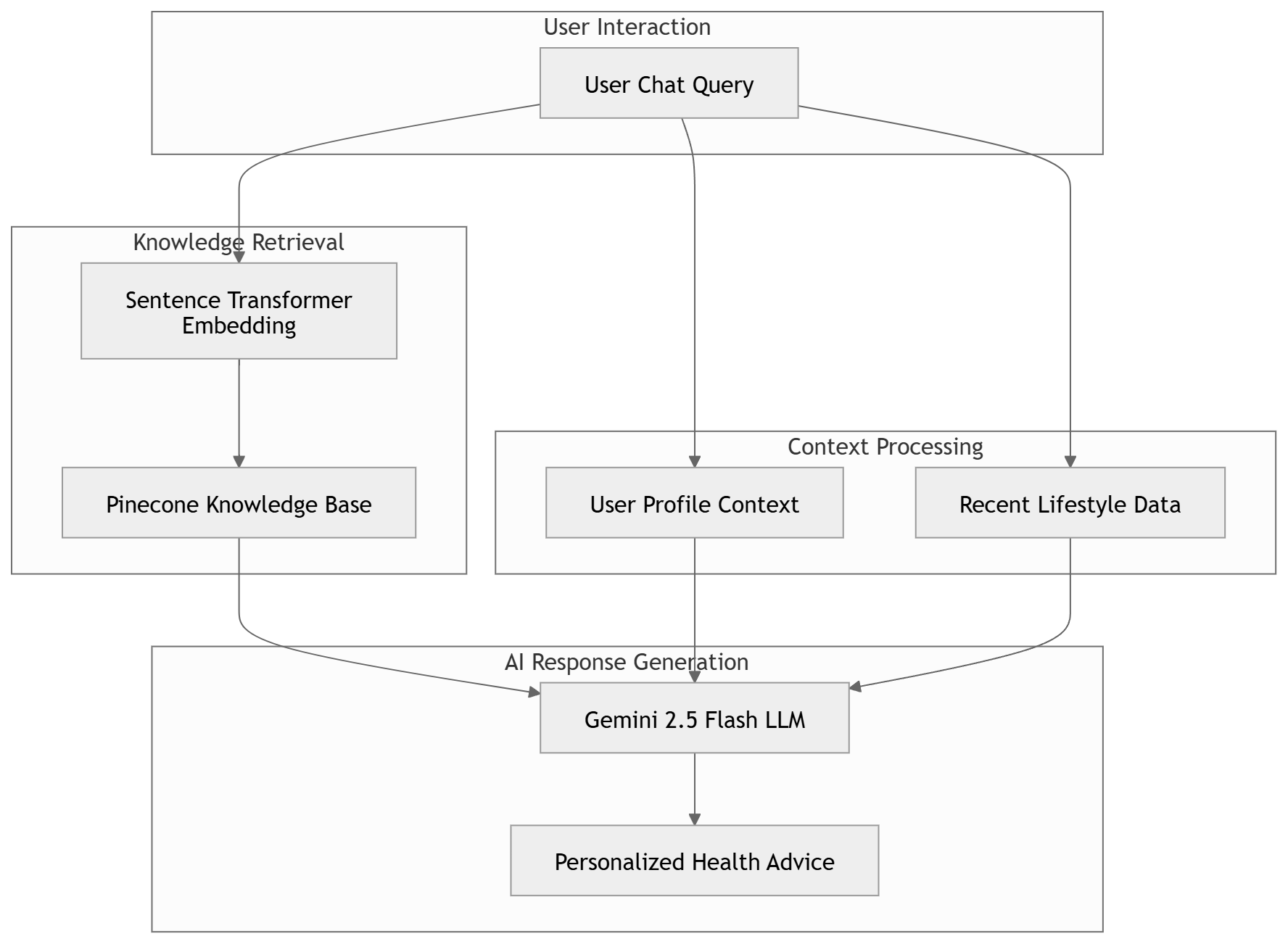 Another key contribution of the system is the integration of personalized recommendation mechanisms powered by large language models and a scientific knowledge retrieval system. By combining behavioral data with research-based health knowledge stored in a vector database, the platform delivers contextual and evidence-informed suggestions to help users make better lifestyle decisions.
