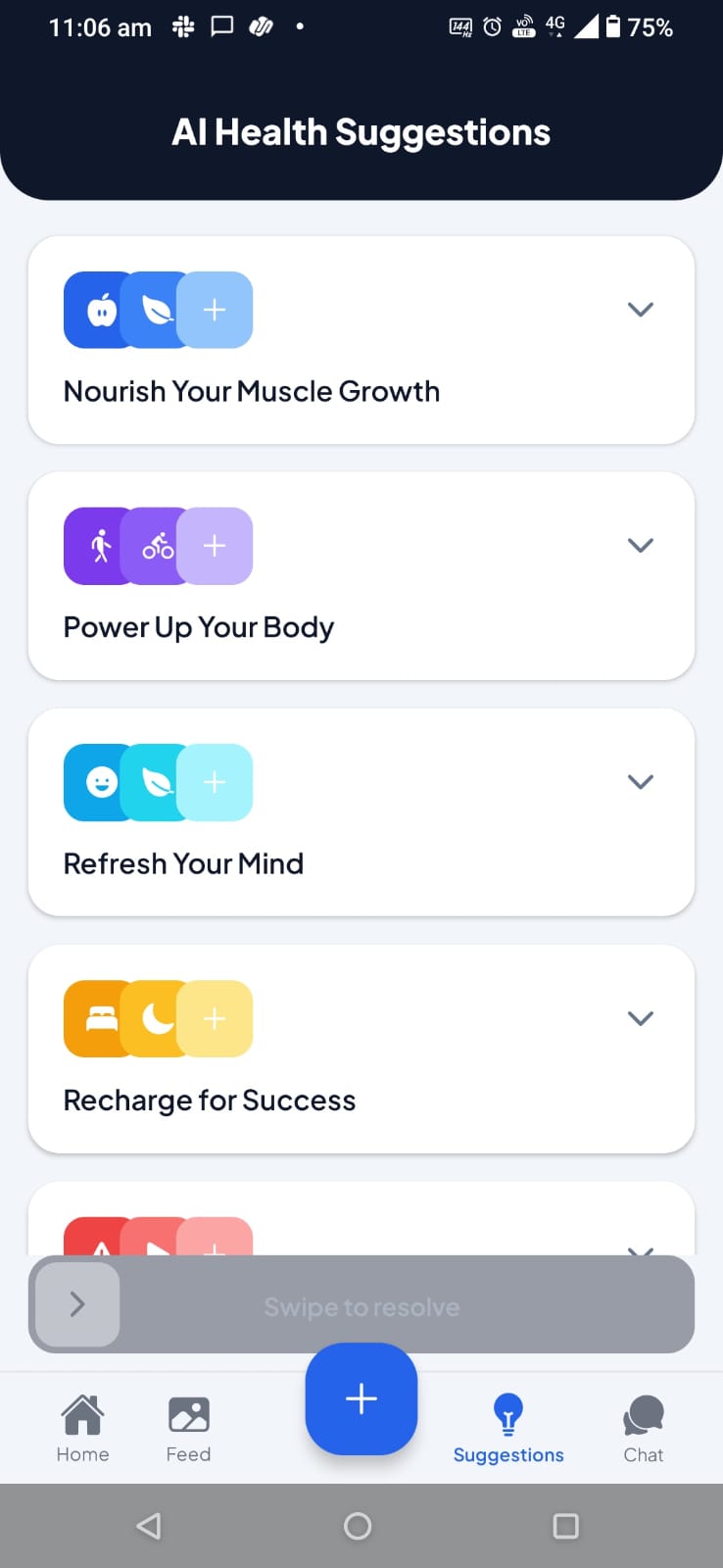 Figure 5.12: AI-generated health suggestions categorized across multiple wellness domains including nutrition, fitness, mental well-being, and sleep.