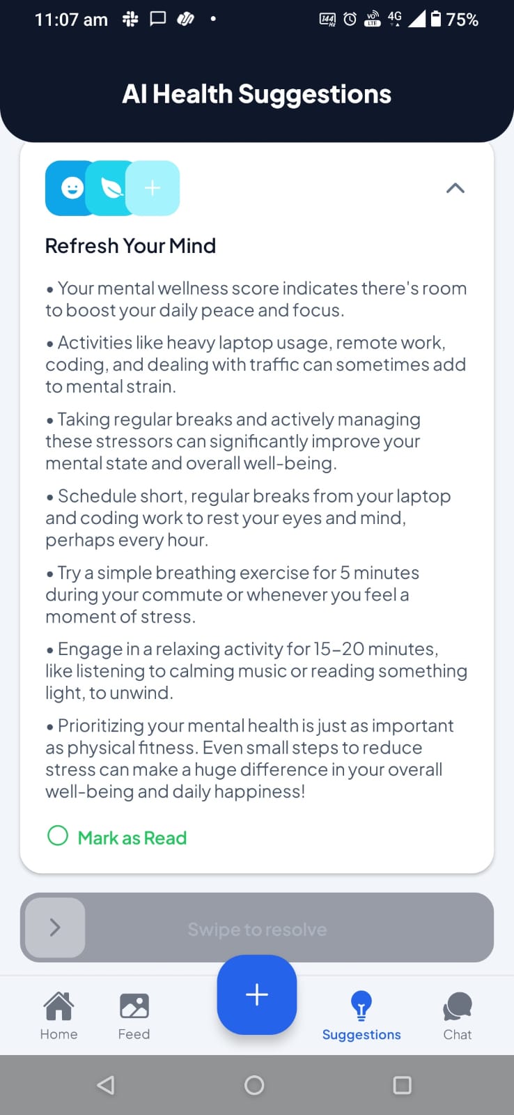 Figure 5.13: Detailed AI-generated recommendation providing actionable advice to improve mental well-being based on detected lifestyle patterns.