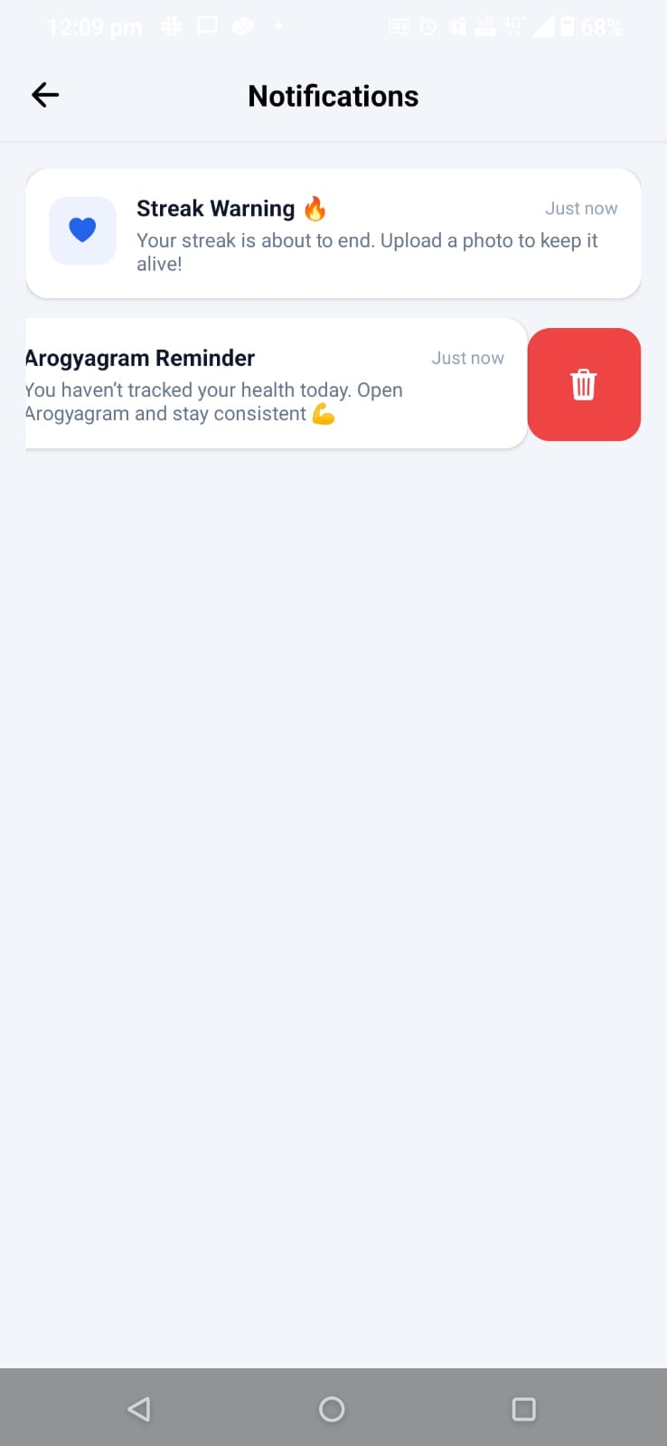 To maintain consistent user engagement and encourage long-term healthy behavior, the Arogyagram platform implements an intelligent notification system. The notification system monitors user interaction patterns and provides timely reminders and motivational alerts when inactivity is detected.